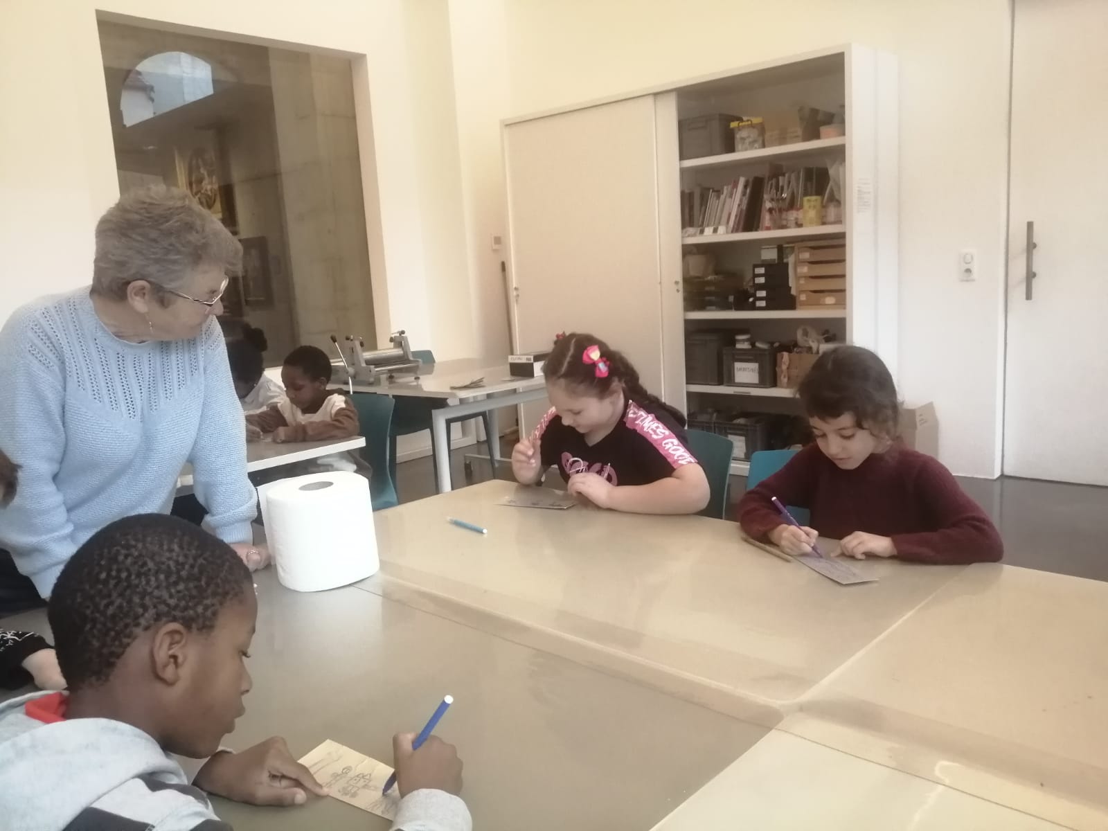 Ensuite, chacun a pu dessiner ce qu’il avait envie sur une plaque d’aluminium. Ces traits ont ensuite été creusés à l’aide d’une gouge pour créer le relief. La dernière partie s’est déroulée dans le musée. Les enfants ont appris à encrer leur réalisation et à découvrir leur dessin sur feuille après passage sous presse et séchage. Un prolongement de cette activité est d’ores et déjà programmé avec un travail en polychromie.